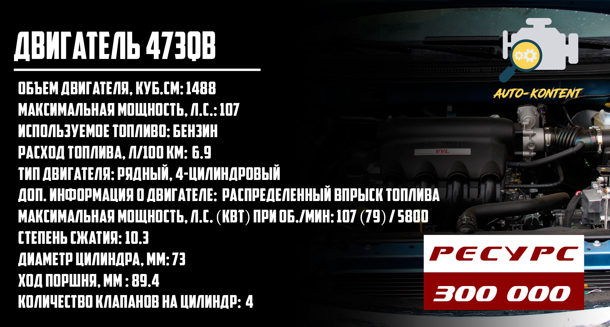 Мотор 473QB фактически представляет собой хондовский силовой агрегат L-серии. Единый блок цилиндров с коленчатым валом, шатунами и поршнями как в моторе L15A на 1497 куб. см. Блок четырехцилиндровый алюминиевый, головка 16-клапанная так же выполнена из алюминиевого сплава. Система распределенного впрыска топлива, гидравлические компенсаторы отсутствуют, но есть гидравлические компенсаторы. Цилиндры расточены под 73 мм, а поршень ходит на 89.4 мм. Максимальная мощность силового агрегата равняется 107 лошадиным силам, а пиковый момент составляет 144 Нм. Было создано довольно большое число модификаций L15A, но, что касается 473QB, то он повторяет версию с головкой на четыре свечки.