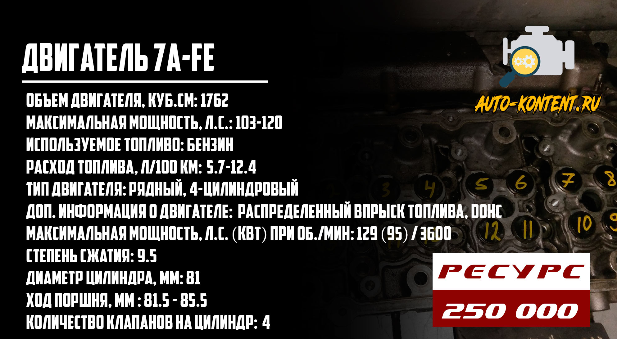 Это бензиновый силовой агрегат с рабочим объемом 1.8 литра, который выпускали с 1993 по 2002 год. Чугунный блок накрыт 16-клапанной алюминиевой головкой блока цилиндров. От предыдущих инжекторных собратьев практически ничем не отличается. В приводе газораспределительного механизма два распредвала с приводом впускного распредвала ремнем, выпускной распредвал вращается от впускного посредством шестерни. Гидрокомпенсаторы отсутствуют. Все это делает мотор надежным, ремонтопригодным. Отремонтировать 7A-FE не представляет особой трудности. В нем сложно найти какие-либо изъяны и проблемные места. Хорошая надежность и отсутствие проблем с запасными частями делают 7A-FE достойным силовым агрегатом.
