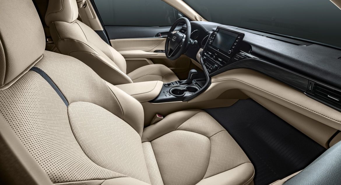 Внутри «спортивная» Camry получила отделку кожаных сидений и салона с красной прострочкой, декоративные вставки специального дизайна, логотип «GR» на кнопке запуска двигателя и обратной стороне ключа зажигания, а также систему выбора режимов движения (Eco/Normal/Sport).