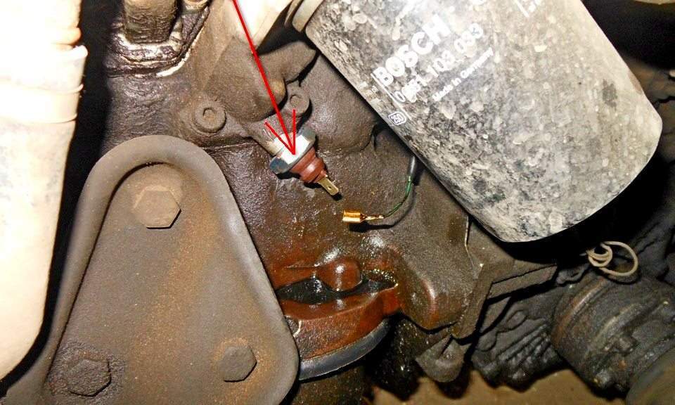 Снизу мотора Audi вкручен датчик, измеряющий давление смазки. Именно от него показывается значок на приборной панели. Когда место его входа становится негерметичным, появляются потеки. Жирный след может немного подняться вверх по корпусу ДВС, но большая часть капель сосредоточится с правой стороны мотора.