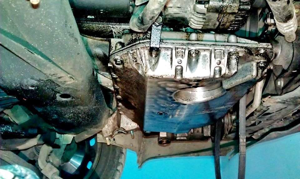 Нередко течи возникают из‐под поддона. Это хорошо видно по запотевшей одной из сторон двигателя Ауди. Если от вибрации опустились фиксирующие болты, можно попытаться их подтянуть. В других ситуациях нужна замена прокладки. Но стоит внимательно осмотреть картер, поскольку трещины в блоке от удара тоже нарушают герметичность.