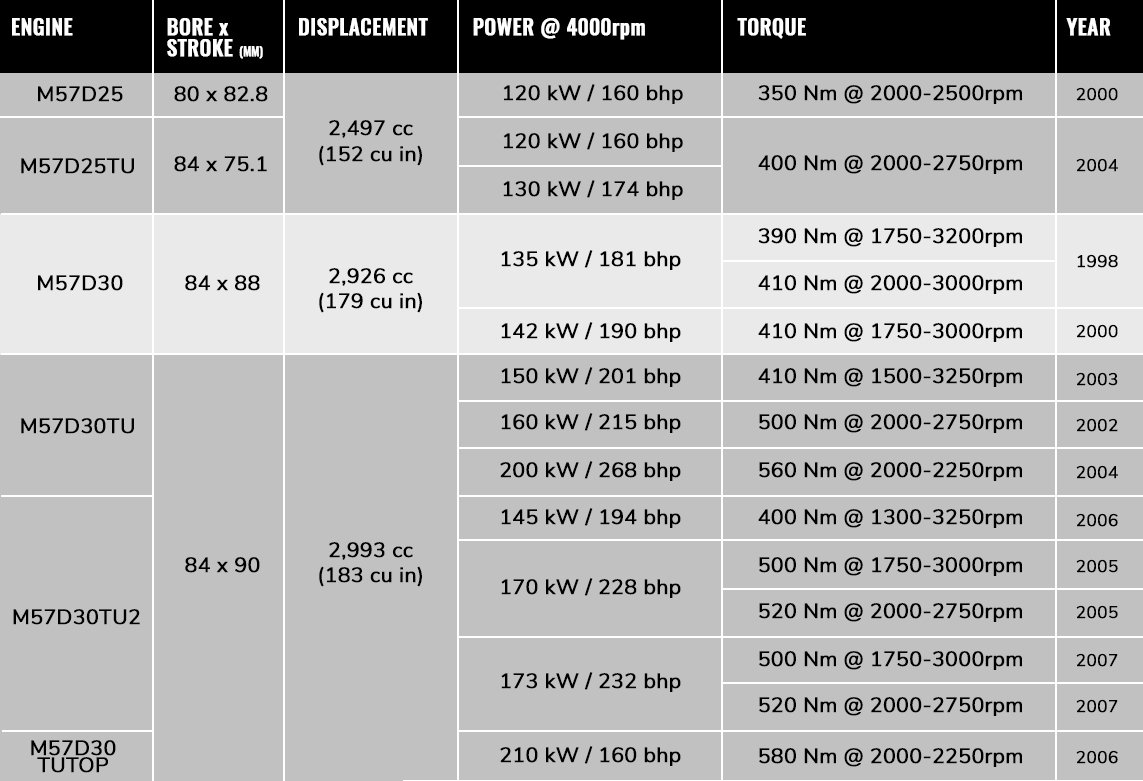 Это 6-цилиндровый двигатель с 24-клапанной головкой, системой впрыска Common Rail, системой рециркуляции отработавших газов и турбонагнетателем с изменяемой геометрией. В 2002 году появился новый вариант этого двигателя — M57N.