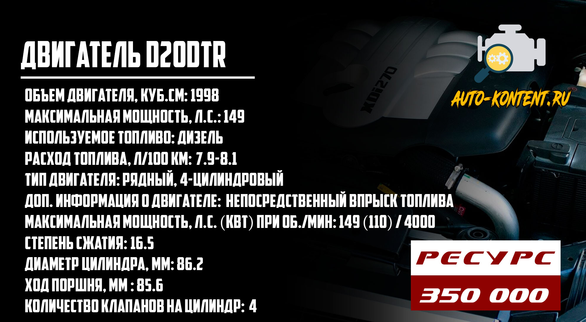 Модификация двигателя D20DTR соответствует экологическим стандартам Евро-5. Это относительно новая силовая установка, производство которой было начато в 2012 году. Двигатель сразу же поставили под капот SsangYong Actyon Sports и SsangYong Rexton, а через год и на SsangYong Stavic. Практически целиком и полностью он повторяет D20DT, что касается принципиальных конструкторских решений. Поэтому многие недостатки и слабости сохранились.