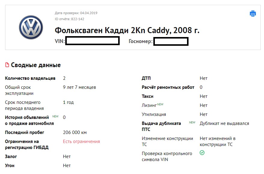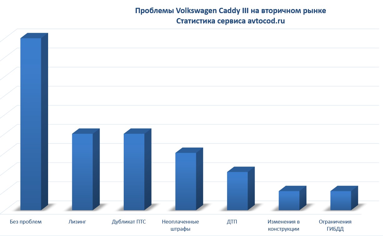 Volkswagen Caddy востребован на вторичном рынке. Только за последние два месяца его проверили 1543 раза. Отобрав 20 случайных моделей из базы avtocod.ru, мы выяснили, что почти каждый второй автомобиль отдавался без технических и юридических проблем. Четыре авто числилось в лизинге и столько же имело дубликат ПТС. Три из 20 продавались с неоплаченными штрафами, два — после ДТП и по одному — с ограничениями ГИБДД и внесением изменений в конструкцию ТС.