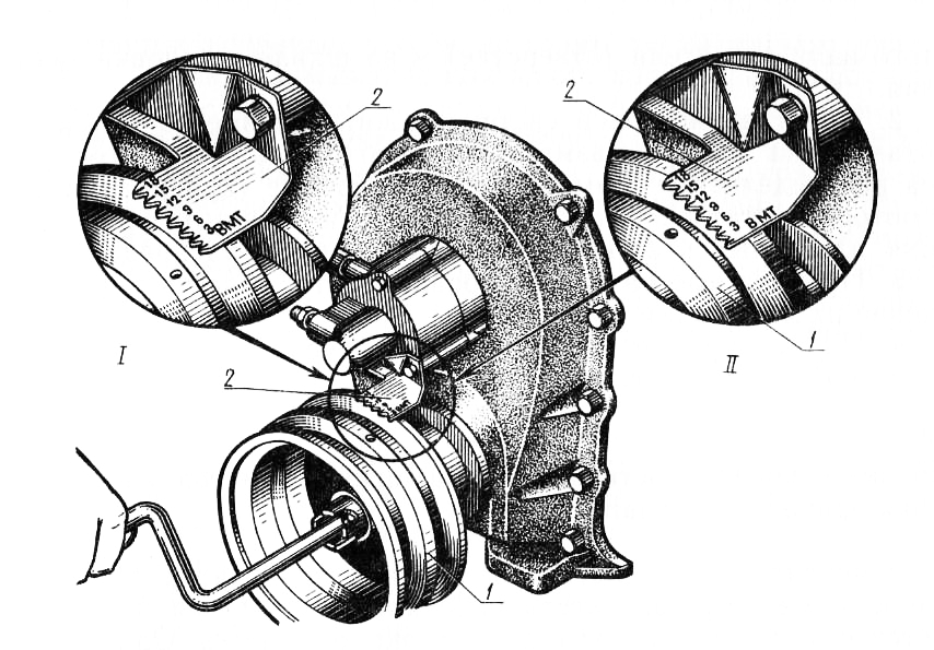 Рис. 1. Определение ВМТ и установка зажигания на двигателе ЗИЛ-130 (ЗИЛ-131):1 — шкив коленчатого вала; 2 — указатель установки зажигания; I, II — опережение зажигания на 0° и 9°