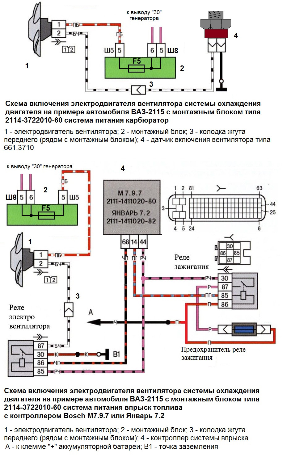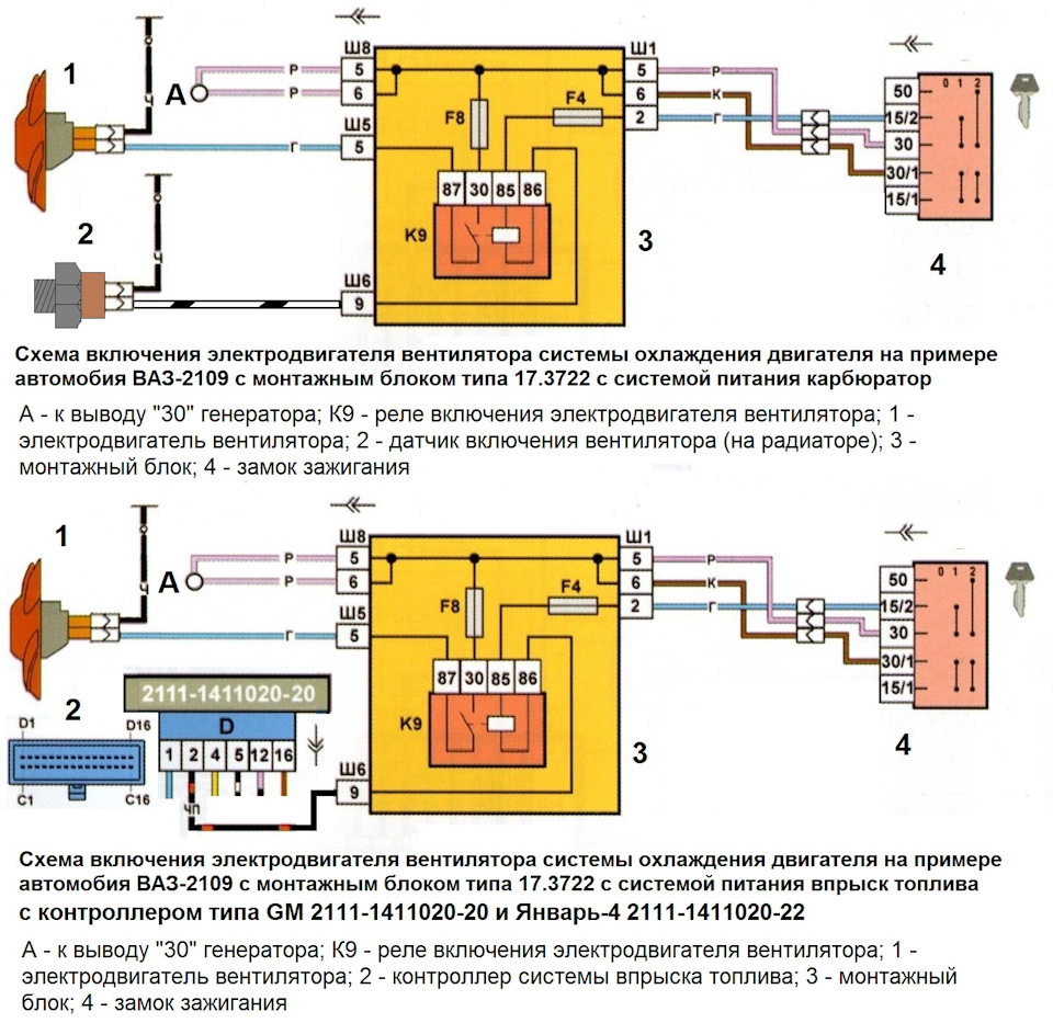 Первый вид блоков с 9 реле: К1 — реле фароочистителейУ них:Вентилятор: на Ш5/5 плюс подаётся напрямую, и вентилятор включался путём соединения его с массой датчиком или релюшкой управляемой мозгами инжектора. Датчик стоит расчитанный на больший ток.Поэтому возникает иногда ситуация, когда после замены блока вентилятор не выключается. Можно в таком случае врезать реле (30 и 87 в разрыв любого провода на вентилятор, 86 к плюсу зажигания, 85 к датчику или мозгам инжектора).