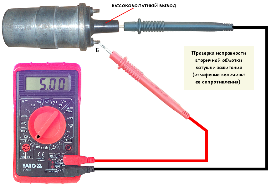 Щупы мультиметра или автотестера в режиме омметра присоединяем: один к боковому выводу «Б» катушки, другой к ее центральному высоковольтному выводу.