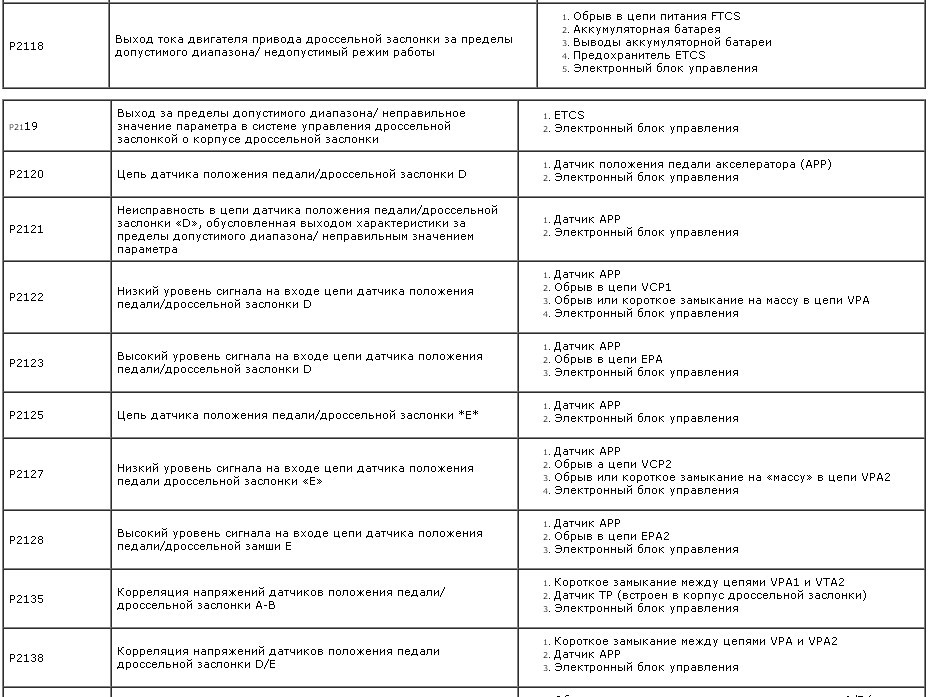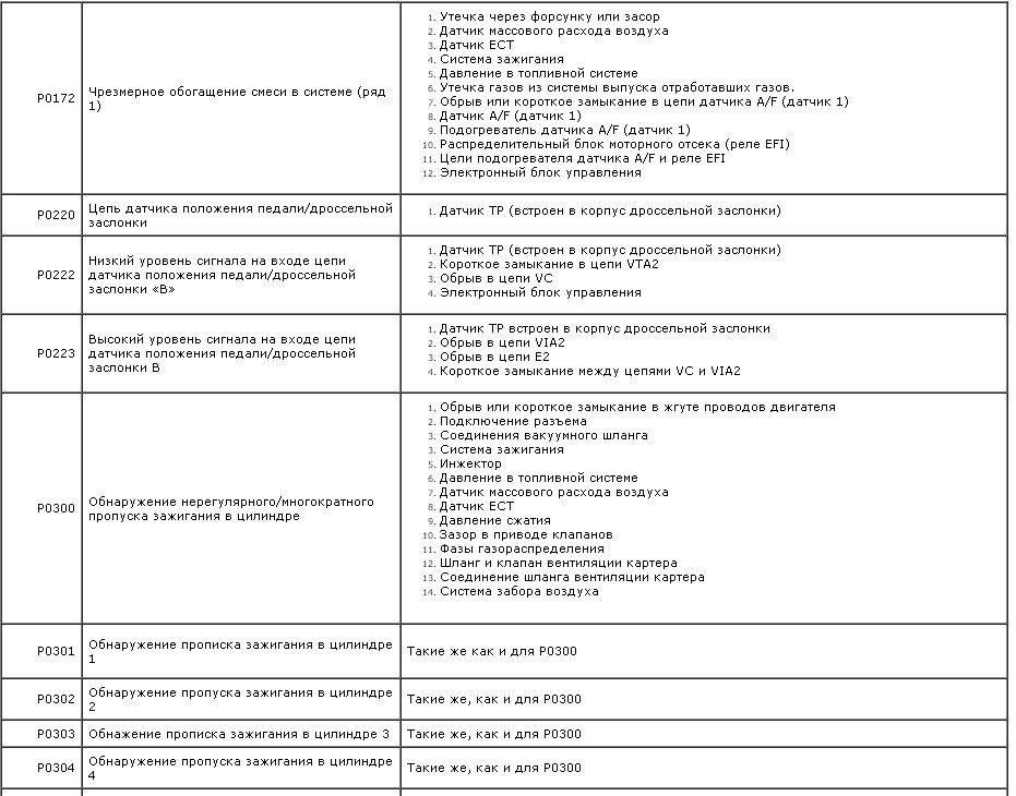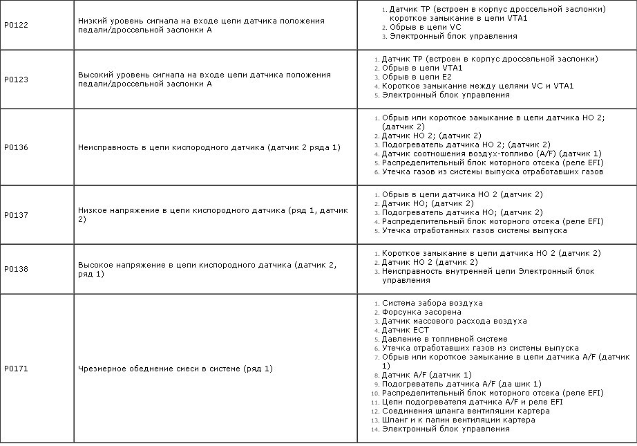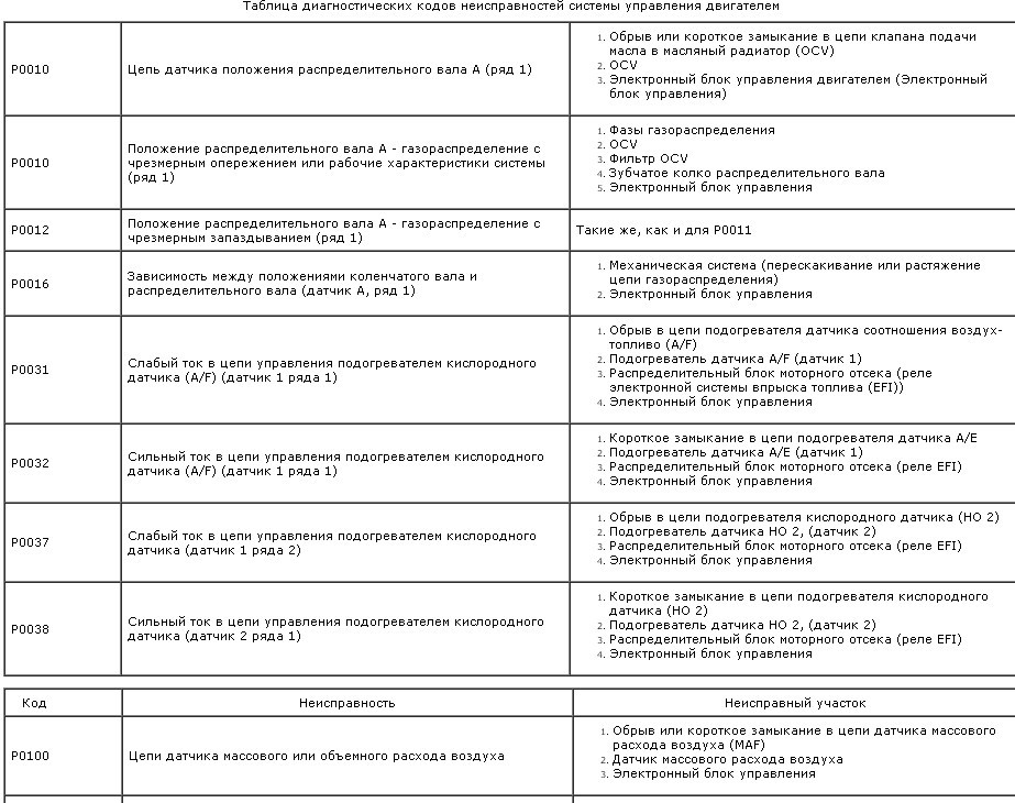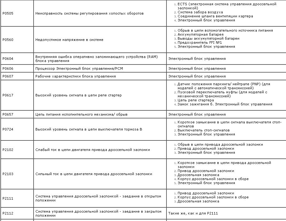 Ниже приведены расшифровка основных кодов ошибок по двигателю, их возможные причины.