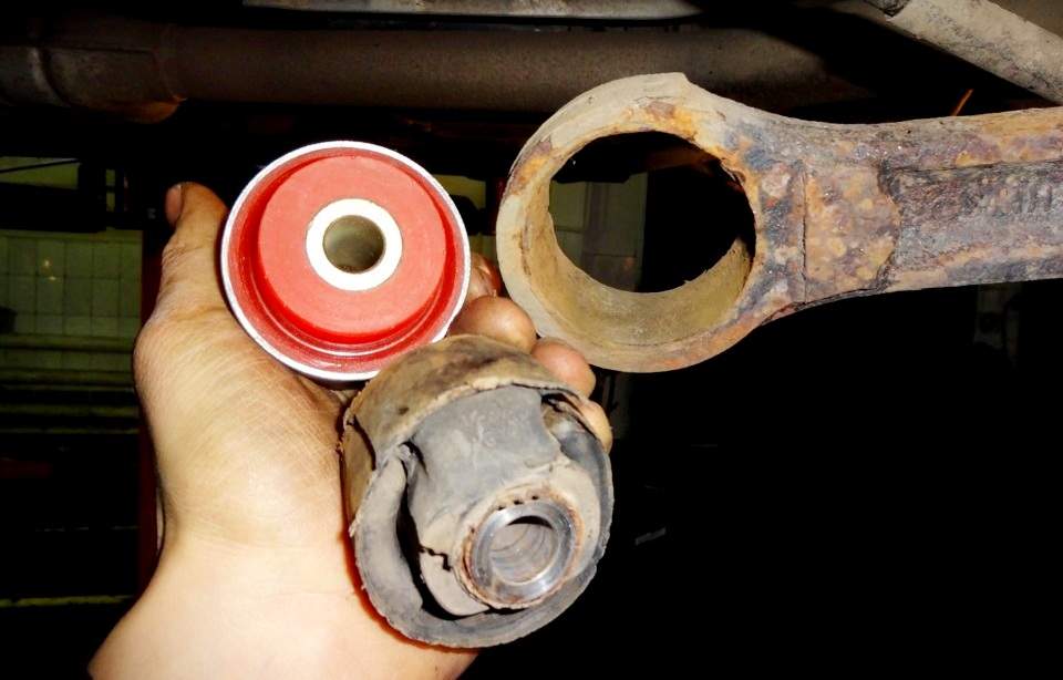 Спереди скрип при движении возникает из‐за износа сайлентблоков. Резиновые втулки загрубевают, отрываются от металлической обоймы и начинают скрипеть при проезде неровностей. Они шумят в передних верхних и нижних рычагах подвески.