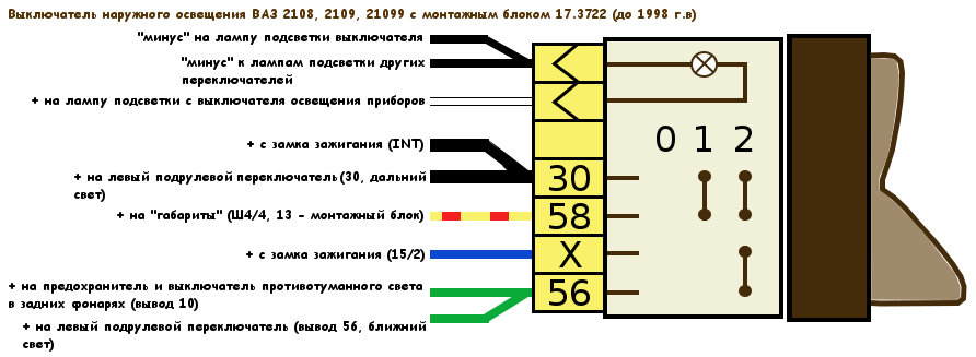 Соединения переключателя наружного освещения схема №1 (автомобили ВАЗ 2108, 2109, 21099 до 1998 г.в. с монтажным блоком 17.3722)
