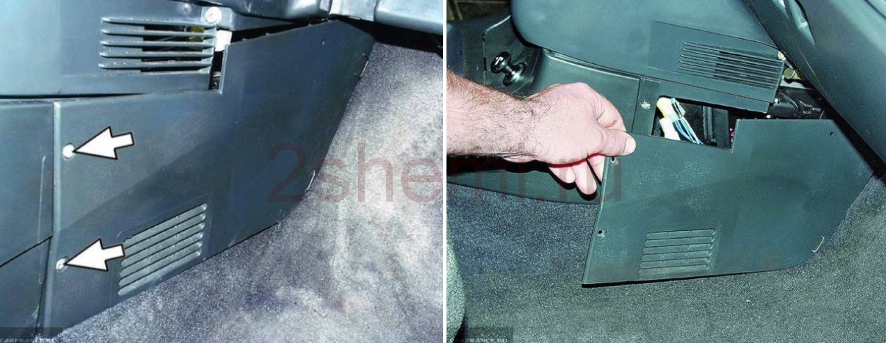 - Первым делом найдите предохранители. Они располагаются около передней консоли с правой пассажирской стороны. Там необходимо отыскать пластиковый щиток и демонтировать его. (Крепится деталь на трех саморезах).