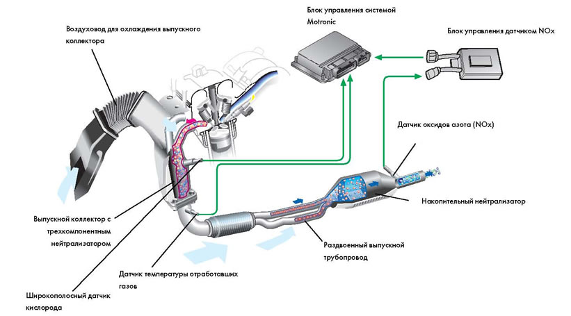 Эта система была приспособлена к двигателю с непосредственным впрыском бензина. До настоящего времени система очисткиотработавших газов двигателей с непосредственном впрыском была проблематичной. Это связано с тем, что образующиеся при работе на бедных гомогенных и послойных смесях оксиды азота не могут быть восстановлены в обычных трехкомпонентных нейтрализаторах до уровня, допускаемого законодательством. Поэтому для двигателей с непосредственным впрыском бензина применяют накопительные нейтрализаторы, которые способны удерживать оксиды азота при работе на бедных смесях. При заполнениинейтрализатора до предела производится перевод его на режим регенерации, в процессе которого накопленные в нем оксиды азотавыводятся и восстанавливаются до азота.