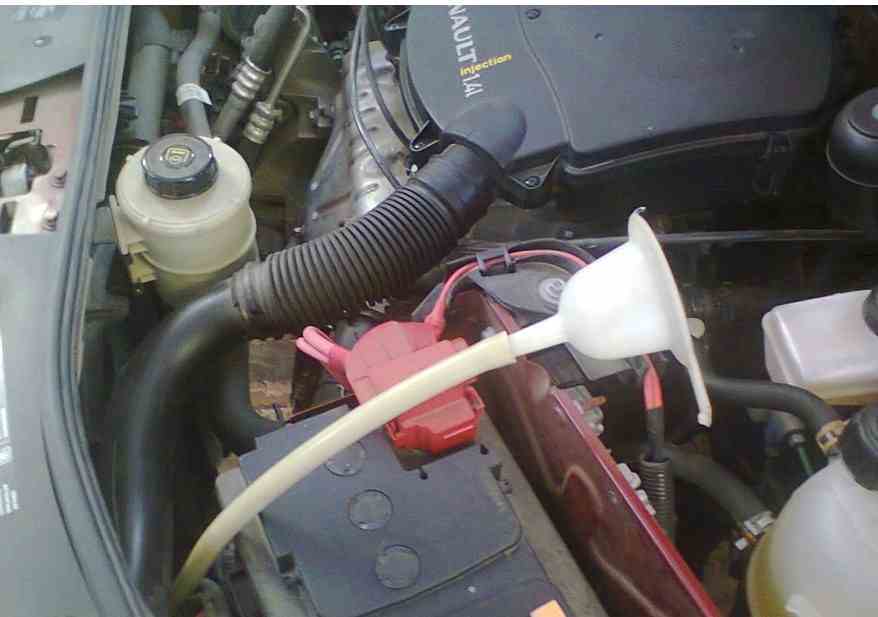 7.Для заливки нового масла используйте самодельную воронку с отрезком шланга либо специальный шприц для заправки технических жидкостей. Шланг сначала проденьте сверху моторного отсека, после чего снизу направить в заливное отверстие.