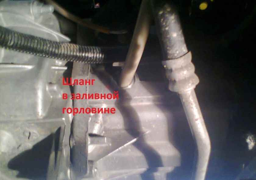 - Заливка нового смазочного материала. Для заливки новой смазочной жидкости понадобится воронка со шлангом. Сначала нужно открутить пластмассовую пробку заливной горловины. В нее необходимо вставить шланг, воронка при этом размещается в пространстве под капотом. Заливаем новую смазку в КПП. После чего закручиваем крышку горловины.