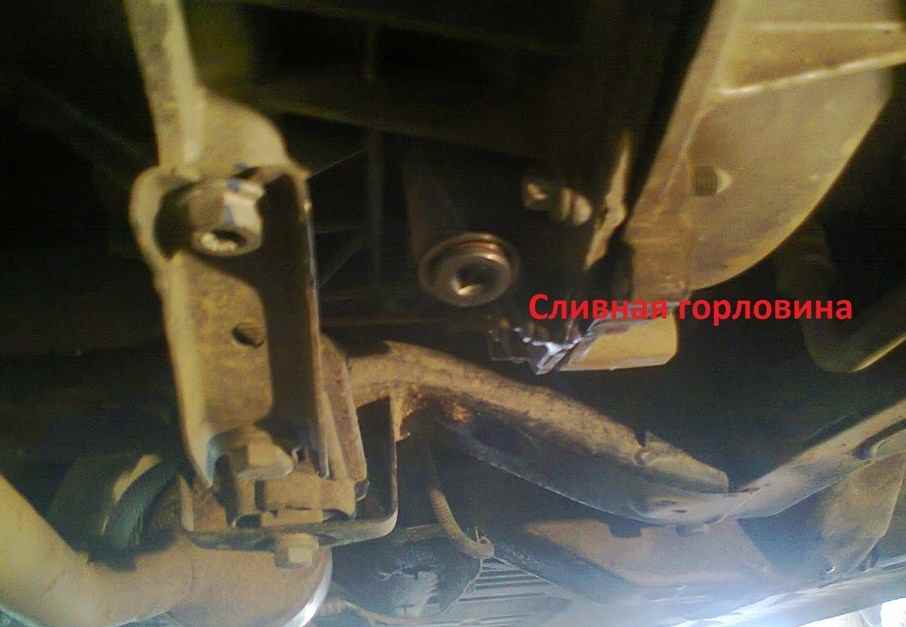 - Спуститесь под машину и подставьте под проверочную пробку емкость для слива.