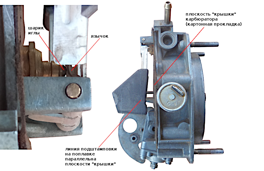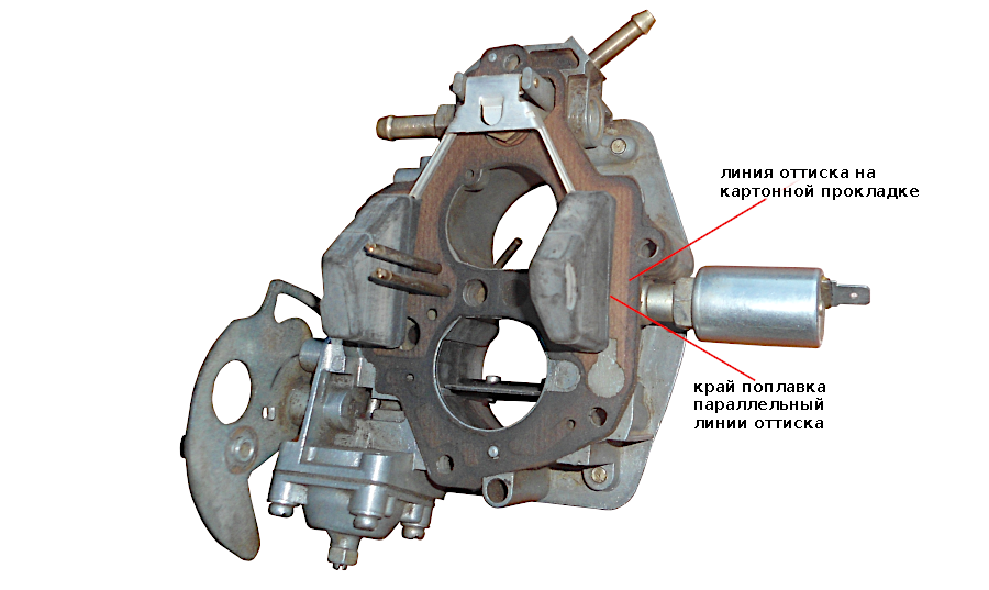 Смотрим сверху на горизонтально установленную крышку карбюратора. Поплавки должны располагаться параллельно линиям оттиска на картонной прокладке крышки. Если нет, подгибаем рычаги поплавков.