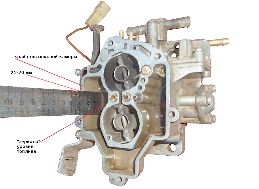 Используем линейку. Расстояние от края поплавковой камеры до «зеркала» топлива, в случае если уровень топлива нормальный, должно составлять 25-26 мм. См. фото выше.